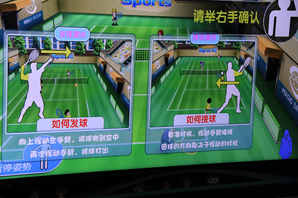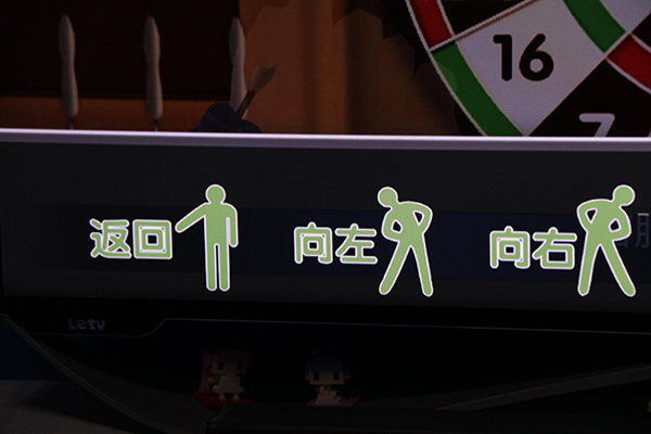 游戏中可以用相应的姿势进行暂停操作 最开始我进行了一个飞镖游戏的试玩,整个游戏是可以任意移动来确定光标位置,之后用户要向后移动手臂锁定目前然后快速向前做出投掷飞镖的动作,在这个游戏的体验中因为首次接触到体感摄像头所以并不是很适应,但是经过一段时间的试玩之后掌握到了锁定的技巧之后,准确率以及成功率都提升了不少。