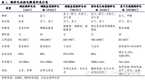 燃料电池按燃料类型可分为直接型、间接型和再生型;按电解质种类又可分为碱性燃料电池(AFC)、磷酸盐型燃料电池(PAFC)、熔融碳酸盐型燃料电池(MCFC)、固体氧化物型燃料电池(SOFC)和质子交换膜燃料电池(PEMFC)。