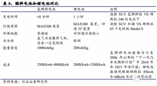 锂电池和燃料电池相比较,锂电池的优势在于更安全、成本更低;而燃料电池的优势则在于充电时间更短、能量密度更高。从目前的技术看,氢燃料电池需要新建一个产业链来支撑,这需要很长的时间和大量的投资。而锂电池从发明以来,随着技术的进步和产业化的扩充,每年都有小幅度的降价和容量提升。日本在2005年就开发出来了性能比特斯拉Model S更优异的Eliica,但是当时锂电池的高昂价格注定这个产品只是试验品。而目前特斯拉电动车火爆全球,比亚迪正在开发性能不逊色于特斯拉Model S的E9,宝马混合动力的i3、i8都要上市,保时捷918也已经预订。这都说明2013年锂电池的价格已经降低到一个可以接受的范围。未来几年,随着锂电池价格的进一步下降和容量的进一步提升,电动车的普及度有望进一步提升。总而言之,短期来看锂电池主导的电动车会是主要方向,氢燃料电池则需要长期的发展,但有望后来居上。