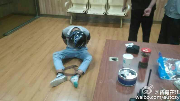 肇事司机神智还不清楚,用头撞墙,自残,警察给其戴上了头盔